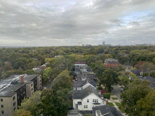 Using code from this blog post, I attempted to align a timelapse of 31 images taken out my window. Of those, 15 images aligned successfully (not sure the issue with the others). I then combined them into a gif using: